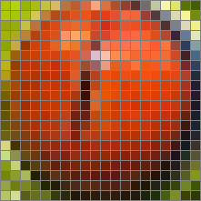 >>>frog <- readImageRGB "images/frog.jpg">>>writeImage "images/frog_eye_grid.png" $ pixelGrid 10 $ crop (51, 112) (20, 20) frog