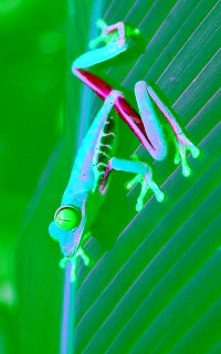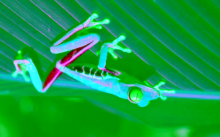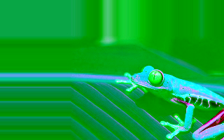 >>>frog <- readImageRGB RPU "images/frog.jpg">>>displayImage $ upsample (const (0, 0)) (\ k -> if k `mod` 10 == 0 then (2, 4) else (0, 0)) frog