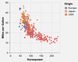 The Vega-Lite example gallery contain a number of visualizations of the "cars.json" dataset (and many other datasets ;-), which has a number of columns to display, such as "Horsepower", "Miles_per_Gallon", and "Origin". The following code will create a visualization that plots the efficiency of the cars (the "mpg") as a function of its Horsepower, and color-code by the origin of the car: