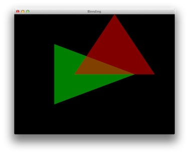 This program draws two half-transparent shapes. When you press a key they are rendered in the opposite order. This makes one appear as if it were in front of the other. Because the depth test (see Graphics.GL.Low.Depth) must be disabled while using this kind of blending, there may be significant overdraw in areas with many blending layers. This can harm performance. Also the order-dependency can make using alpha blending in a 3D scene complex or impossible. It may make more sense to use an off-screen render pass (see Graphics.GL.Low.Framebuffer) and an appropriate shader to simulate transparency effects.