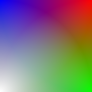 matFromFuncImg :: forall size. (size ~ 300) => Mat (ShapeT [size, size]) ('S 4) ('S Word8) matFromFuncImg = exceptError $ matFromFunc (Proxy :: Proxy [size, size]) (Proxy :: Proxy 4) (Proxy :: Proxy Word8) example where example [y, x] 0 = 255 - normDist (V2 x y ^-^ bluePt ) example [y, x] 1 = 255 - normDist (V2 x y ^-^ greenPt) example [y, x] 2 = 255 - normDist (V2 x y ^-^ redPt ) example [y, x] 3 = normDist (V2 x y ^-^ alphaPt) example _pos _channel = error "impossible" normDist :: V2 Int -> Word8 normDist v = floor $ min 255 $ 255 * Linear.norm (fromIntegral <$> v) / s' bluePt = V2 0 0 greenPt = V2 s s redPt = V2 s 0 alphaPt = V2 0 s s = fromInteger $ natVal (Proxy :: Proxy size) :: Int s' = fromIntegral s :: Double