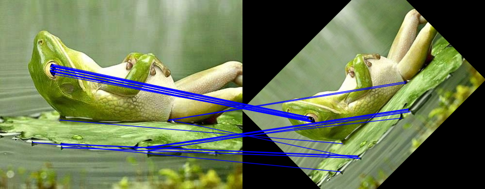 bfMatcherImg :: forall (width :: Nat) (width2 :: Nat) (height :: Nat) (channels :: Nat) (depth :: *) . ( Mat (ShapeT [height, width]) ('S channels) ('S depth) ~ Frog , width2 ~ (*) width 2 ) => IO (Mat (ShapeT [height, width2]) ('S channels) ('S depth)) bfMatcherImg = do let (kpts1, descs1) = exceptError $ orbDetectAndCompute orb frog Nothing (kpts2, descs2) = exceptError $ orbDetectAndCompute orb rotatedFrog Nothing bfmatcher <- newBFMatcher Norm_Hamming True matches <- match bfmatcher descs1 -- Query descriptors descs2 -- Train descriptors Nothing exceptErrorIO $ pureExcept $ withMatM (Proxy :: Proxy [height, width2]) (Proxy :: Proxy channels) (Proxy :: Proxy depth) white $ \imgM -> do matCopyToM imgM (V2 0 0) frog Nothing matCopyToM imgM (V2 width 0) rotatedFrog Nothing -- Draw the matches as lines from the query image to the train image. forM_ matches $ \dmatch -> do let matchRec = dmatchAsRec dmatch queryPt = kpts1 V.! fromIntegral (dmatchQueryIdx matchRec) trainPt = kpts2 V.! fromIntegral (dmatchTrainIdx matchRec) queryPtRec = keyPointAsRec queryPt trainPtRec = keyPointAsRec trainPt -- We translate the train point one width to the right in order to -- match the position of rotatedFrog in imgM. line imgM (round <$> kptPoint queryPtRec :: V2 Int32) ((round <$> kptPoint trainPtRec :: V2 Int32) ^+^ V2 width 0) blue 1 LineType_AA 0 where orb = mkOrb defaultOrbParams {orb_nfeatures = 50} width = fromInteger $ natVal (Proxy :: Proxy width) rotatedFrog = exceptError $ warpAffine frog rotMat InterArea False False (BorderConstant black) rotMat = getRotationMatrix2D (V2 250 195 :: V2 CFloat) 45 0.8