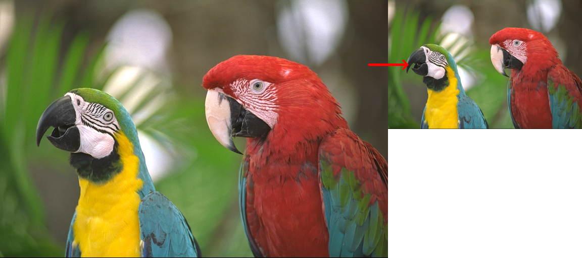 resizeInterAreaImg :: Mat ('S ['D, 'D]) ('S 3) ('S Word8) resizeInterAreaImg = exceptError $ withMatM (h ::: w + (w `div` 2) ::: Z) (Proxy :: Proxy 3) (Proxy :: Proxy Word8) transparent $ \imgM -> do birds_resized <- pureExcept $ resize (ResizeRel $ pure 0.5) InterArea birds_768x512 matCopyToM imgM (V2 0 0) birds_768x512 Nothing matCopyToM imgM (V2 w 0) birds_resized Nothing lift $ arrowedLine imgM (V2 startX y) (V2 pointX y) red 4 LineType_8 0 0.15 where [h, w] = miShape $ matInfo birds_768x512 startX = round $ fromIntegral w * (0.95 :: Double) pointX = round $ fromIntegral w * (1.05 :: Double) y = h `div` 4