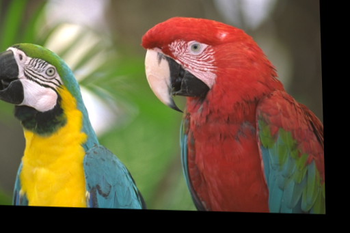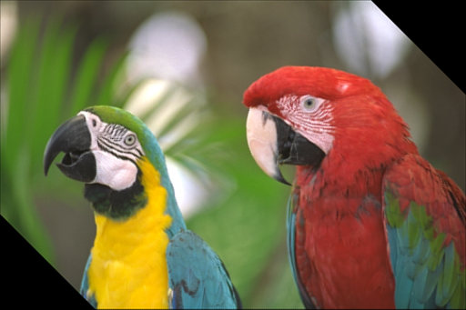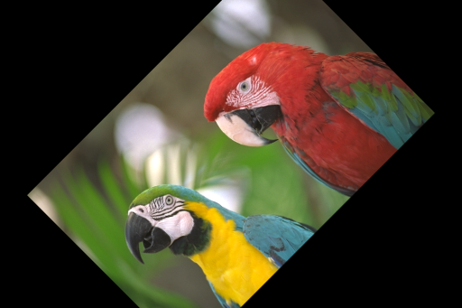 rotateBirds :: Mat (ShapeT [2, 3]) ('S 1) ('S Double) rotateBirds = getRotationMatrix2D (V2 256 170 :: V2 CFloat) 45 0.75 warpAffineImg :: Birds_512x341 warpAffineImg = exceptError $ warpAffine birds_512x341 rotateBirds InterArea False False (BorderConstant black) warpAffineInvImg :: Birds_512x341 warpAffineInvImg = exceptError $ warpAffine warpAffineImg rotateBirds InterCubic True False (BorderConstant black)