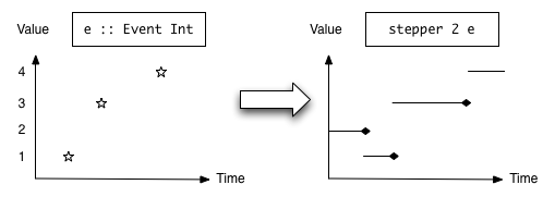 - stepper :: MonadMoment m => a -> Event a -> m (Behavior a)