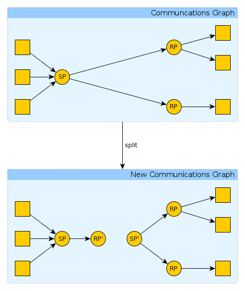 This function splits an existing channel in two; associating a new receive port with the old send port, and a new send port with the existing receive ports. The new receive port starts out empty, while the existing receive ports retain any unprocessed messages.