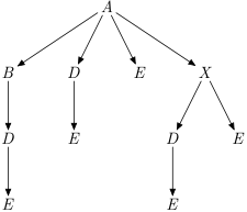>>>runG example $ adjacencyList . transpose . reductionRight [('a',""),('b',"a"),('d',"bx"),('e',"d"),('x',"a")]